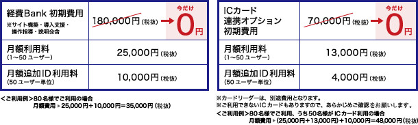 今、ご加入いただくと「経費Bank初期費用」と「ICカード連携オプション初期費用」が無料でご利用いただけます。