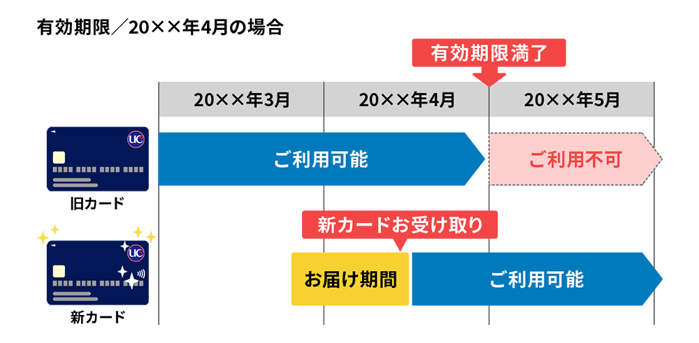 - UC iD/QUICPayは、カード更新のタイミングとは別に有効期限が設定されています。更新時期が近づいたお客様には有効期限更新に関する書面をお送りしますので、お客様にてお手続きが必要です。