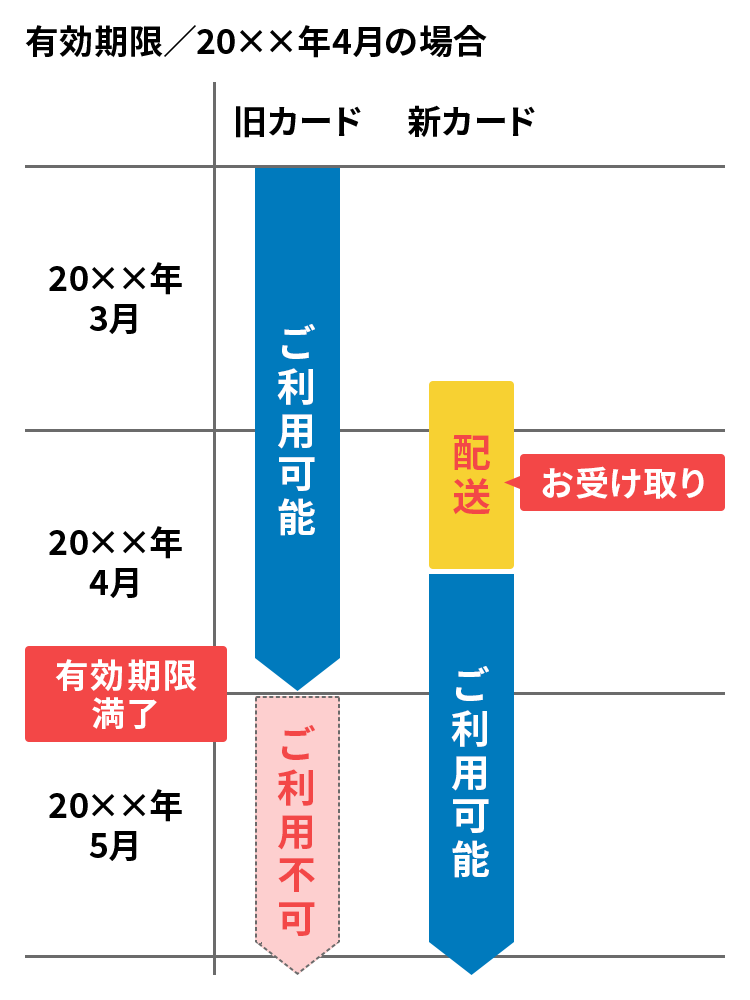 - 長期海外渡航などの理由で更新時期にカードの受け取りが難しい場合は、こちらよりお問い合わせください。