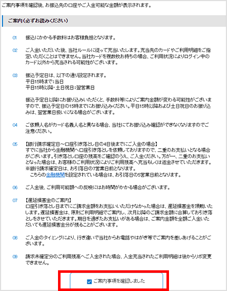15:00以降にお振り込みいただくと、翌営業日での振込処理となり、手数料等によりご案内金額が変わる可能性がございます。 - ご入金後、ご利用可能額への反映にはお時間がかかる場合がございます。