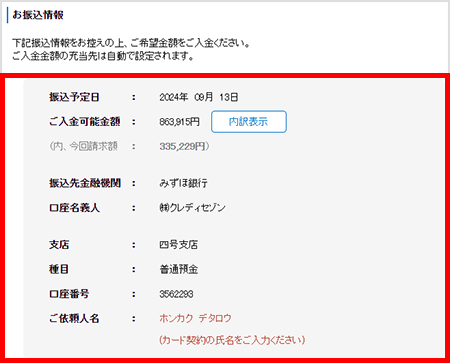 (複数枚同一名義カードをお持ちの場合は、当社発行セゾンカードを含む合算利用残高をご案内) - ④ 入金可能金額のうち、ご返済希望金額を当社指定口座へお振り込み