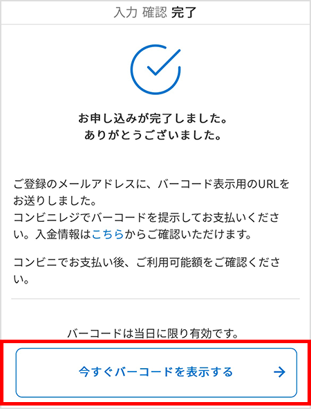 - バーコード発行後に新たなご利用データが届くなど残高に変動があると、お支払後ご利用可能枠に反映するまでお時間がかかる場合がございます。申し込み完了後、お早めにお支払いください。