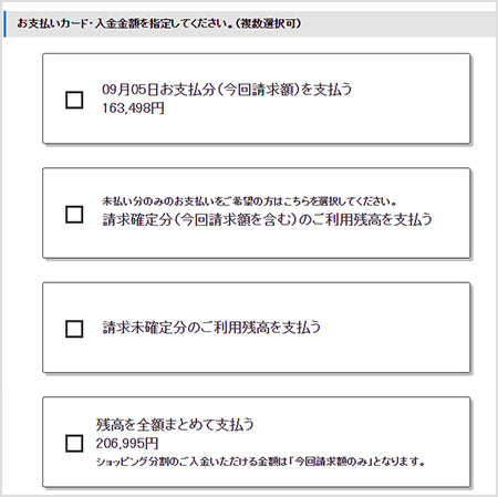 - 請求確定分のご利用残高(ショッピング・キャッシング・年会費・分割払い・その他手数料)