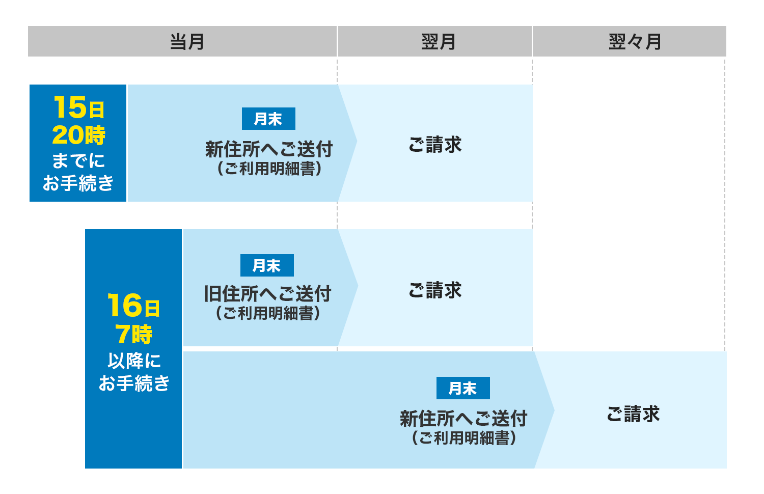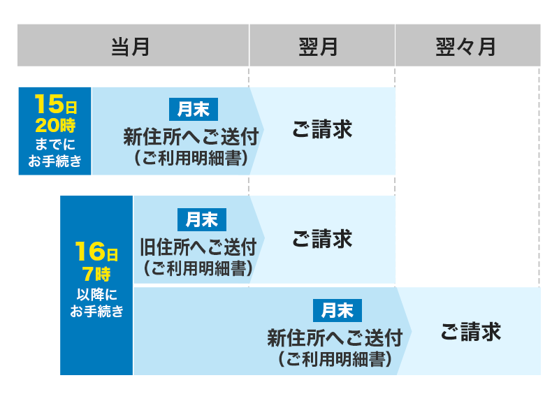 - ● 毎月16日7時以降にお手続きされた場合、翌々月請求のご利用明細書から新しいご住所へお送りいたします。