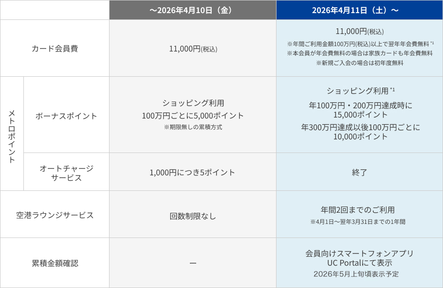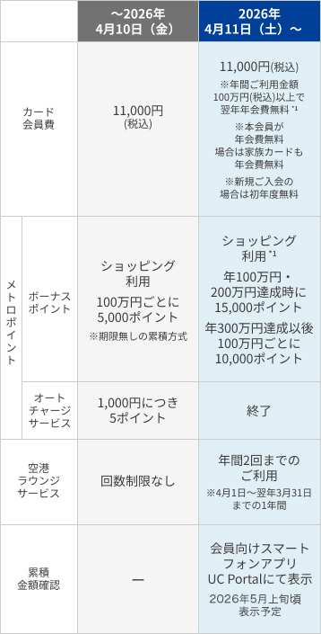 このたび、Tokyo Metro To Me CARD UC ゴールドカードは、変化する時代や会員様の多様なニーズにお応えし、より一層ご満足いただけるカードを目指して、2026年4月11日(土)よりサービス内容を一部改定させていただくこととなりました。