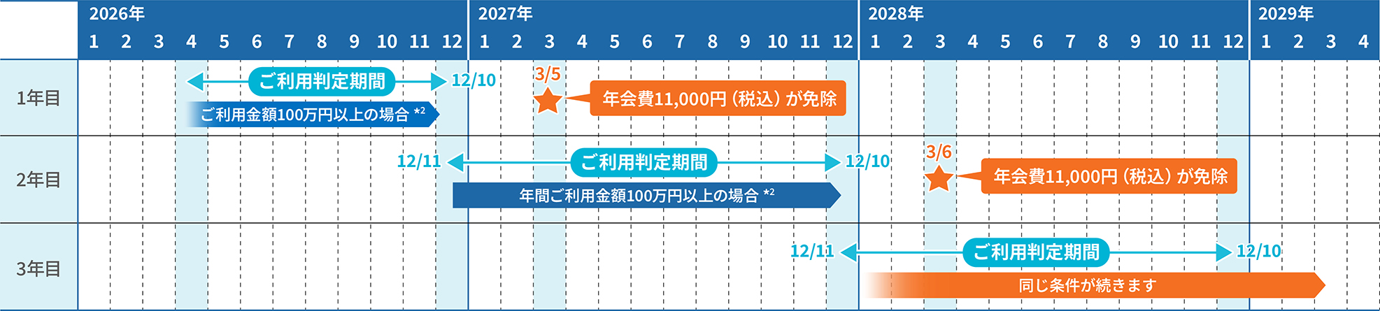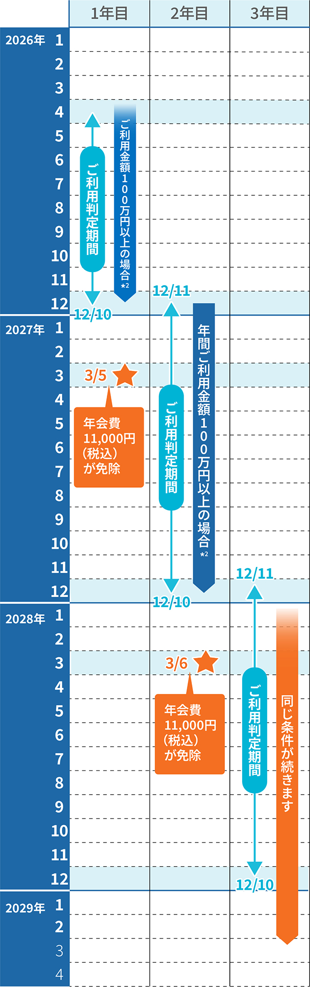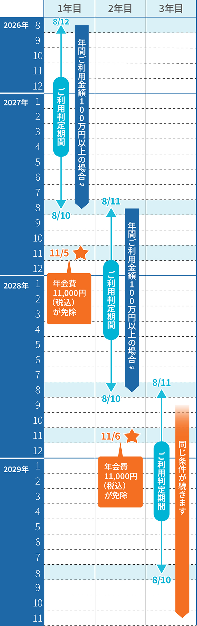 *2 判定期間内にカードのご利用金額が100万円(税込)を超えた場合、年会費は発生しません。永久不滅ポイント対象外のご利用は、年間ご利用金額には加算されません。