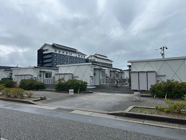 輪島市の市街地中心部の海岸付近にある、プレハブ型の応急仮設住宅です。以前は、この場所でイベント等を実施する広場および駐車場でした。後方にある建物は、民間のホテルです。