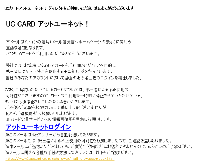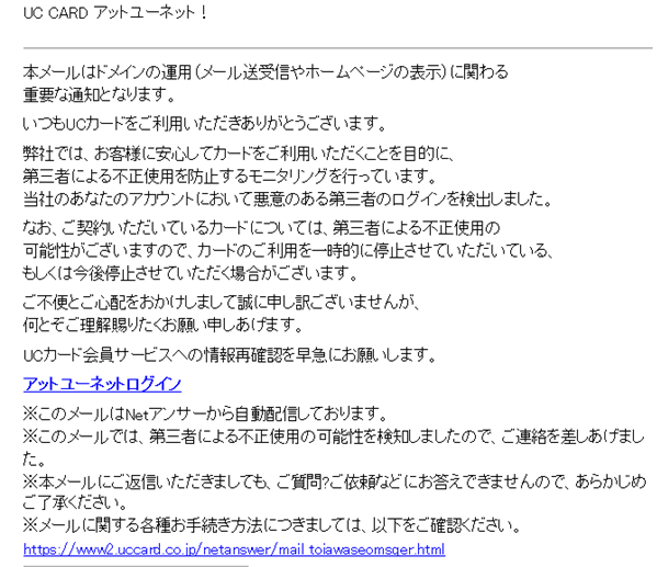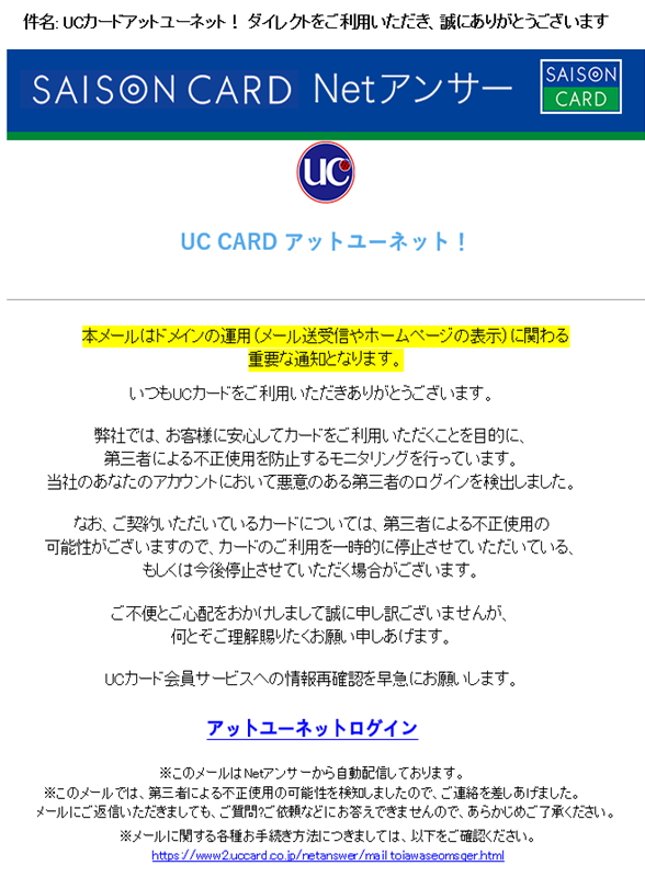 UCカードやアットユーネットをかたるフィッシングメール・SMSにご注意ください!