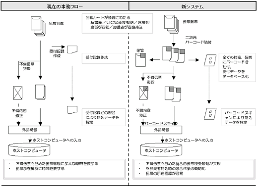 今回のシステムは、伝票受付時点で全伝票と封筒にそれぞれ二次元バーコードを貼付し、抜取伝票管理、外部業者持込管理、伝票所在確認等に用いるものです。