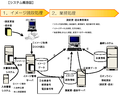 本システムの大きな特徴は、年間60万件に及ぶ会員からの諸変更届などの各種届出書類を受け付けた段階でイメージデータとして取り込み、それをOCR処理で文字認識(数字、カナ、チェック項目認識)し、郵便番号、金融機関コード等を辞書機能により自動変換したうえで基幹システムに登録することです。これにより、従来必要だった社内での書類授受、パンチ入力、精査などの作業を大幅に割愛・自動化でき、処理時間・コストの大幅な削減が可能となります。
