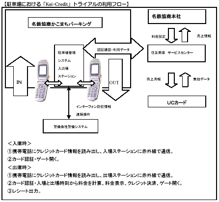 住友商事株式会社(本社:東京都中央区 社長:岡 素之)とユーシーカード株式会社(以下、UCカード 本社:東京都港区 社長:上杉 純雄)は、UCカードがKDDI株式会社と共同で実施している携帯電話クレジット決済トライアル「Kei−Credit」(※1)に、名鉄グループの総合商社で駐車場管理をてがける名鉄協商株式会社(本社:名古屋市 社長:陶山 専太郎)と提携し参画します。具体的には、2003年5月8日から名鉄協商が運営する営業用駐車場において赤外線を利用した携帯電話クレジット決済トライアルを開始しました。