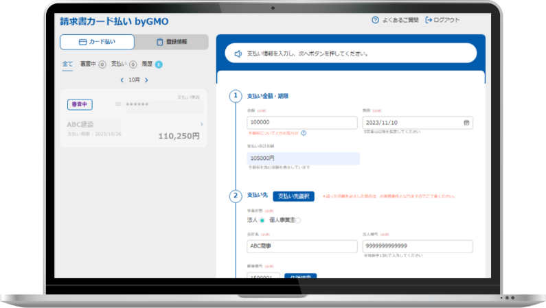 A. ご申請いただいた請求書の振込先への振込額と、本サービスの手数料を合わせて、ご登録いただいたカードのご利用代金としてご請求させていただきます。